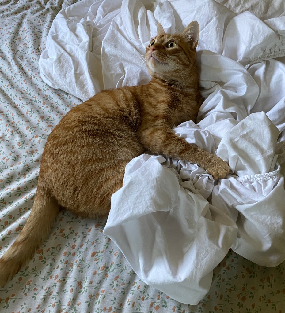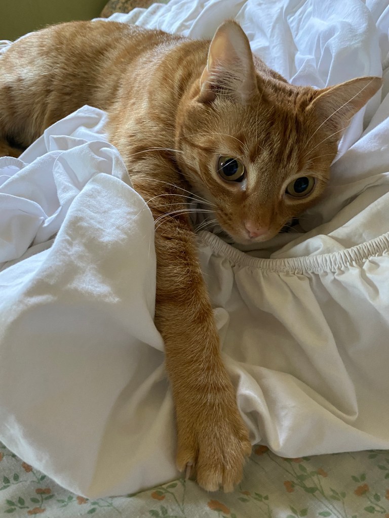 Maybe we shouldn’t have named our cat Leo. He certainly thinks he’s king of all things…like my laundry. He’s right in the middle of it when I throw it on the bed. I literally have to shut him out so I can put on clean sheets and fold my t-shirts. His other talents include fetch, eat, sleep and snuggle. What a guy.