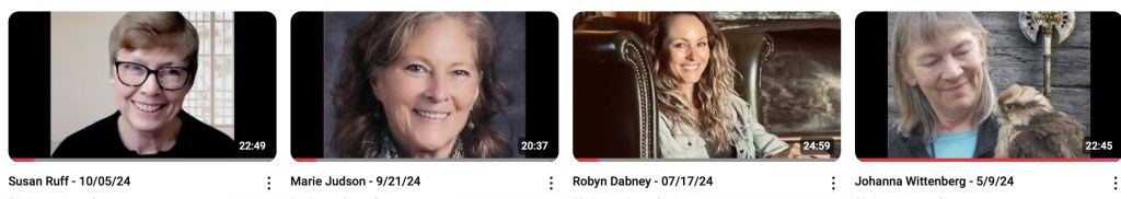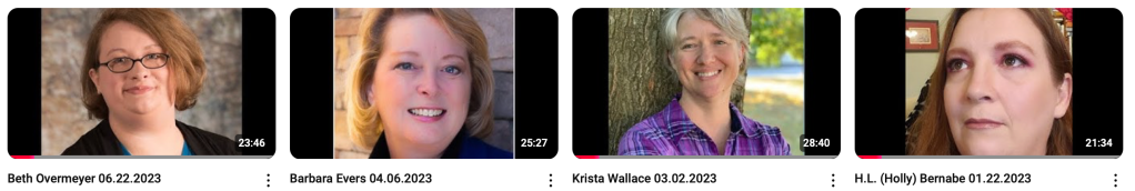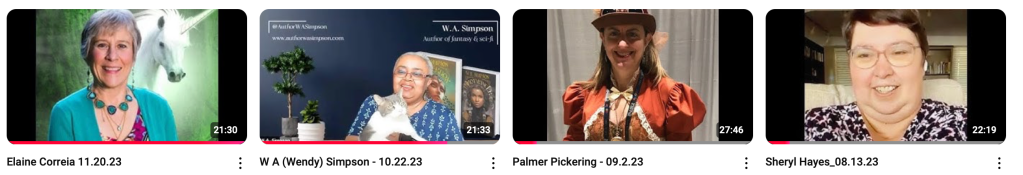 Join a personal look in to the writing lives of indie and small-press authors. We discuss their current works, the writer’s life, what inspires them, favorite travel spots, and cats. Click on any of the images to go directly to the channel.